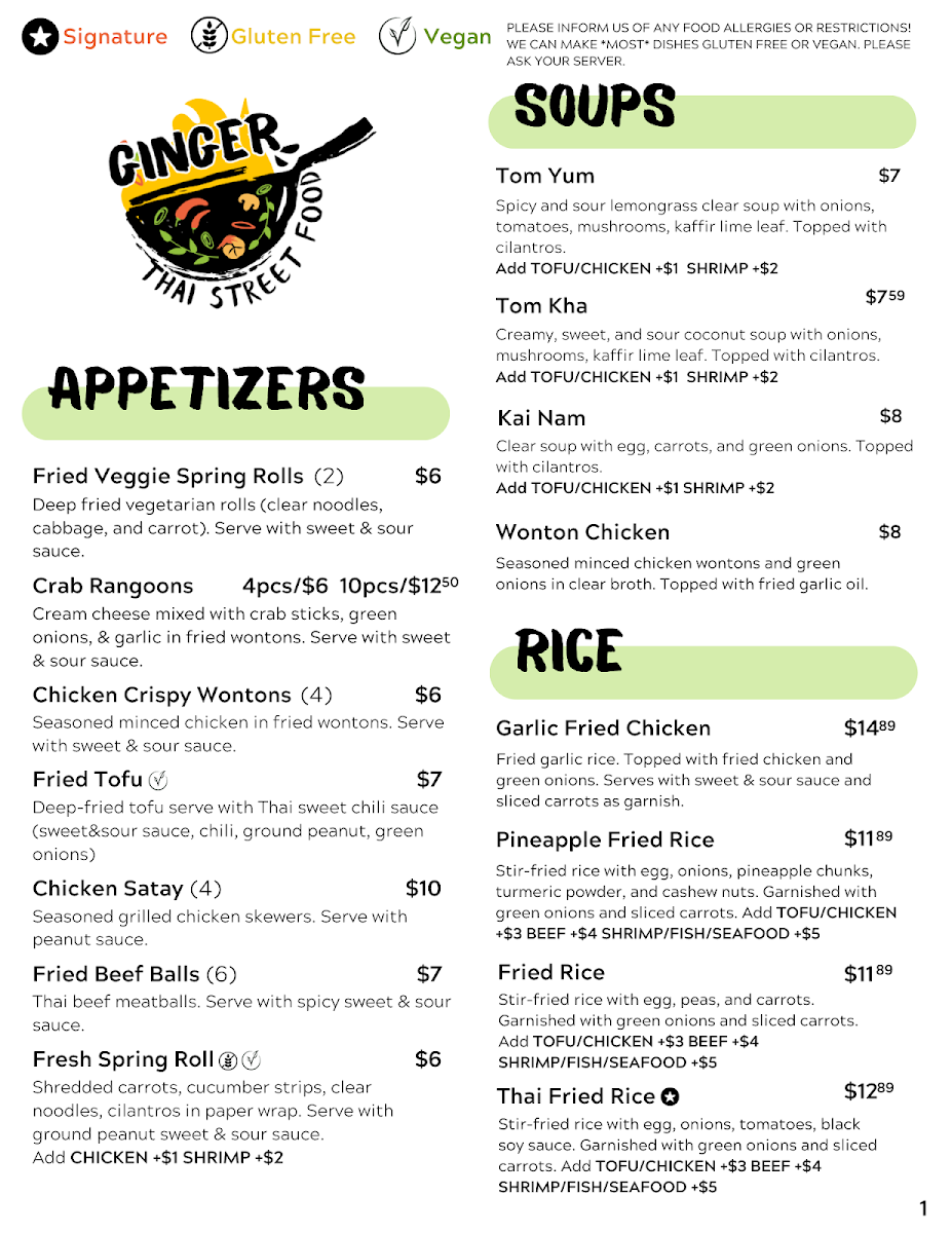 With limited seating, the intimate atmosphere is perfect for small gatherings or carryout orders. Customers praise the friendly service and the restaurant's dedication to quality, often highlighting the authenticity infused by chefs trained in Thailand. Signature dishes like the tom yum soup and pineapple fried rice are must-tries. Experience the warmth of a family-run establishment that offers not just meals, but a taste of home. Don't miss out on this culinary experience; Ginger Thai Cuisine is sure to become a local favorite!